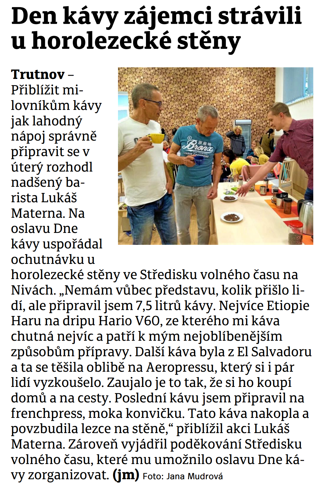 V říjnu 2019 jsem v Trutnově uspořádal "Den kávy" s ukázkou přípravy filtrované kávy na dripu Hario, Aeropressu a Frenchpressu, ochutnávkou výběrové kávy a zúčastnil jsem se jako dobrovolník na brew bau Prague coffee festivalu a soutěži Barista roku 2020.